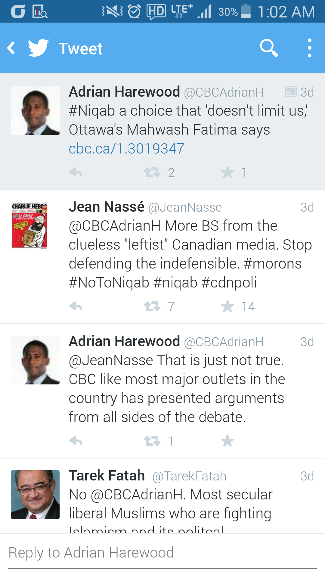 The problem with this response is Canadian niqabis Muslim women are only a small portion of Canadian Muslim women as a whole. Even tweets from non-Muslim white Canadians were included at the opening of the segment. Also, why leave ex-Islamic women out of the debate? If anyone is underrepresented in this debate, isn’t it them?