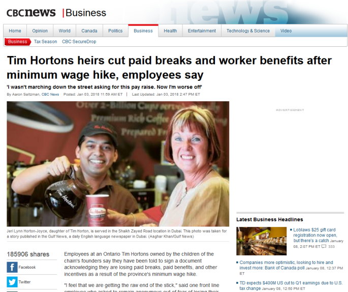Leave it to the premier of Ontario and Canada's state broadcaster to stoke anti-business ire by using Canada's once-beloved homegrown coffee chain as their scapegoat. After Premier Kathleen Wynne rammed through new legislation hiking the minimum wage by 21 per cent at the start of 2018, without conducting any impact assessment and going against … Continue reading Vilification of Tim Hortons and Ontario Small Businesses another bleak sign Canada is in a slow lockstep march towards socialistic collapse